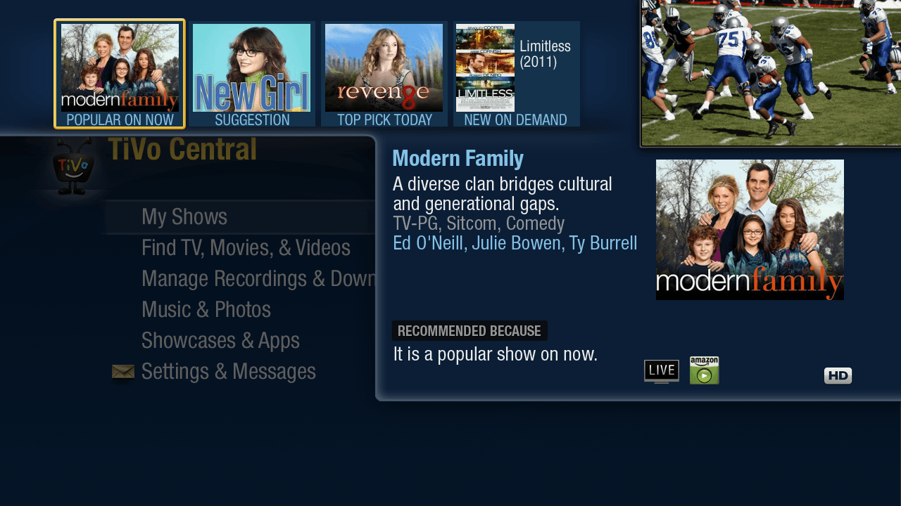 The Discovery Bar gives you a quick way to watch or schedule a show that interests you. We’ve made several changes to the Discovery Bar with this update. We now only show four items in the Bar if the Video Window is on, or six items if the Video Window is turned off. The Bar no longer scrolls, but each time you visit a new screen you’ll continue to see new Discovery Bar items. You can also see at a glance why an item is in the Bar. Each item has a label below the image.