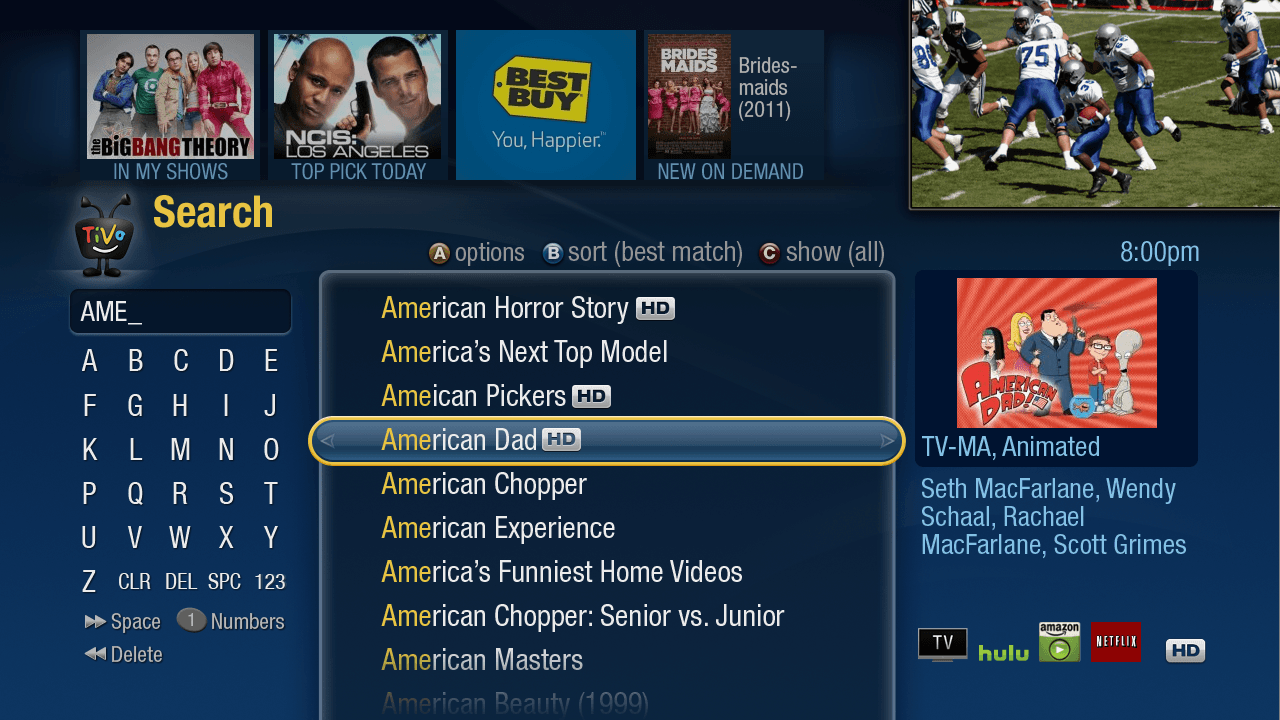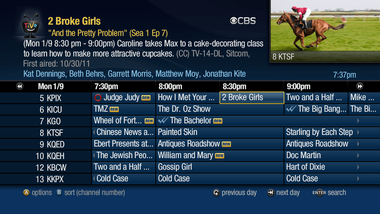 Whether you prefer the traditional Grid Guide or the TiVo Live Guide, both are now updated to take advantage of your HDTV. The Guides display the live or recorded show you’re watching in the corner, instead of in the background. The Guides have icons to show what is currently recording, and what will be recorded. A “new” icon appears next to new episodes, and you can now see the season and episode number and first aired date. You can even sort by channel name if you want to quickly find “CNN” or “USA” and you don’t remember their channel numbers.