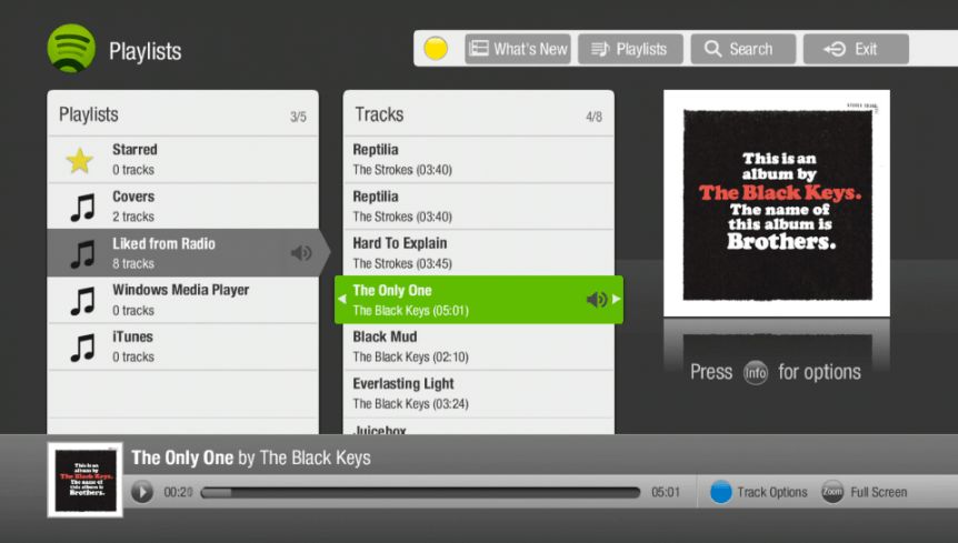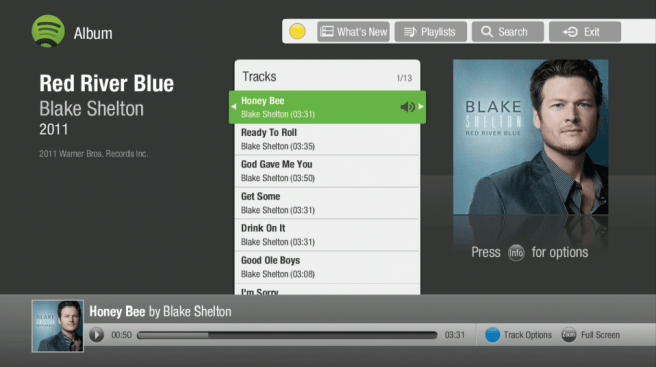 To access this new feature, TiVo customers can sign-in on their TV with existing Spotify Premium accounts. From there they will be able to listen to current playlists, create new playlists, browse playlists, albums and artists, search for related artists and stream millions of free songs through their home theater system. Playlists created on TiVo are available on all Spotify platforms including PCs and smartphones.