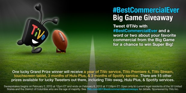 Tweet @TiVo with the hashtag #BestCommercialEver and a little bit about your favorite commercial from the Big Game. One lucky grand prize winner will receive a year of TiVo service, TiVo Premiere 4, TiVo Stream, a touchscreen tablet and more. 15 lucky Tweeters will also win prizes including TiVo swag, Hulu Plus and Spotify services.