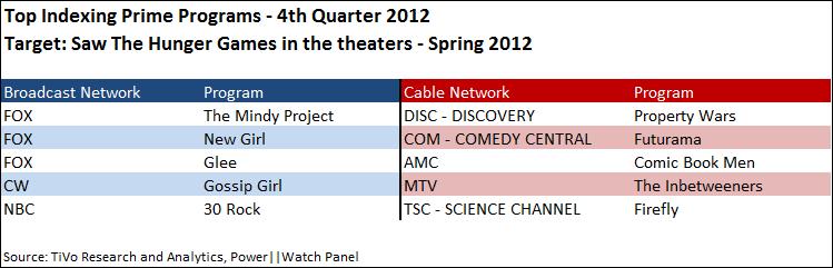 Enter the TiVo Research and Analytics Television Panel. For the past two years, as part of our monthly survey, we have asked our panel members what movies they saw in the theaters during the previous month (as well as what movies they had heard of and what movies they intended to see). Armed with their responses, we can anonymously match panelists’ movie attendance to their television viewing behaviors. Hey Lionsgate! It might interest you to know that over on the broadcast side, during the fourth quarter of 2012, The Mindy Project and New Girl were the top-indexing primetime programs when comparing the rating for The Hunger Games theatergoers to overall household ratings. We don’t want to disparage any specific programs, but you might want to avoid Law & Order SVU and CSI, both of which had minimal overlap with Hunger Games viewers. On the cable side of the dial you might consider MTV’s The Inbetweeners, AMC’s Comic Book Men and (of course!) Firefly on the Science Channel.