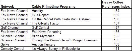 Happy National Coffee Day; have another cup on us. And while you are drinking that cup odds are you are tuned to CBS or Fox News Channel! Based on a recent study of TiVo Research and Analytics data, heavy coffee purchasers tend to watch a disproportionate amount of those two networks in primetime.