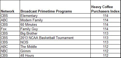 Source: Data are from TRA’s Media TRAnalytics® and are based on the 2nd quarter of 2013. Viewership indices are calculated for the Heavy Coffee Purchaser segment rating for a given program versus the overall program rating.