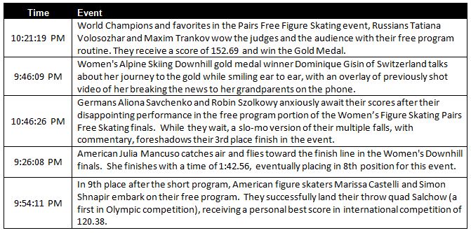 Top Moment #2 showed Dominique Gisin of Switzerland smiling ear-to-ear while recounting the road to her gold medal in the Women’s Downhill, including shots of her purportedly breaking the news to her grandparents over the phone.