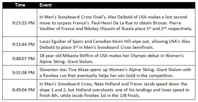 Following Men’s Snowboarding was Women’s Alpine Skiing in the Giant Slalom event, where 18-year-old American prodigy Mikaela Shiffrin was to make her Olympic debut. Her first run scored her in at our number 3 Top Moment and was solid enough to place her 5th in the overall event. Slovenia’s Tina Maze put together a near flawless set of runs to achieve Gold and the 4th spot on our TiVo line-up.