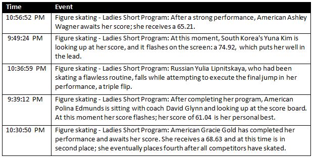 While the Olympic buzz for Wednesday, February 19th included chatter about Team USA’s Ted Ligety’s performance in the Alpine Skiing: Men’s Giant Slalom finals (he won the gold), and Bobsleigh: Women’s Heat 4 (where USA’s Team 1 of Elana Meyers and Lauryn Williams won Silver and which added Lauryn Williams to a short list of athletes to medal in both the Summer and Winter Olympic Games), in the end the Top 5 Moments all occurred during NBC’s coverage of the Figure Skating – Ladies Short Program.