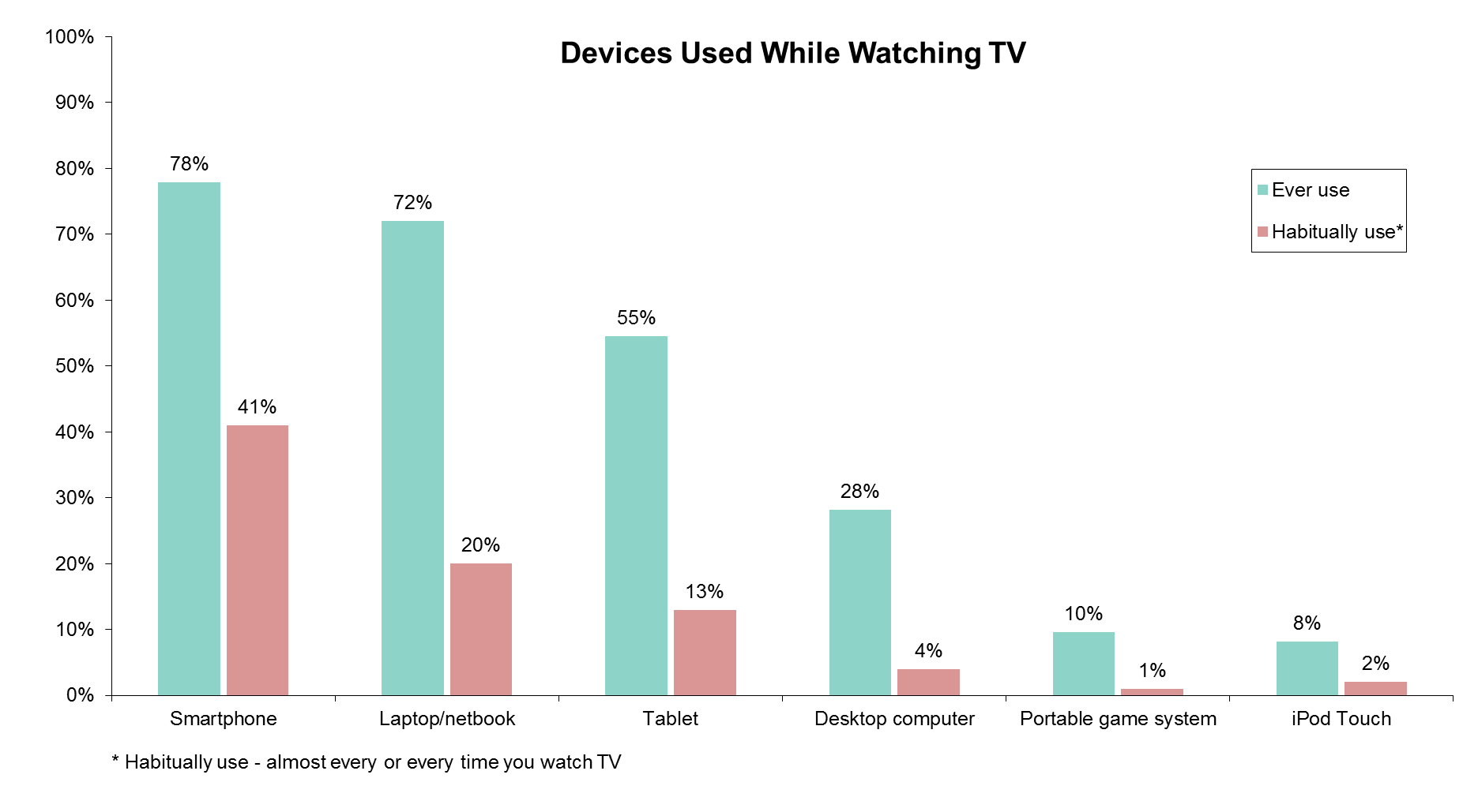 - The smartphone (78 percent) and the laptop (72 percent) are the two most popular devices used while watching TV (see graph below).