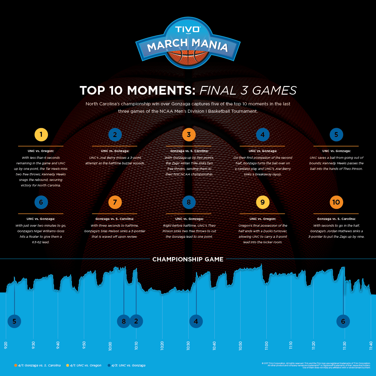 | 4 | 10:33 p.m. ET | UNC vs. Gonzaga: